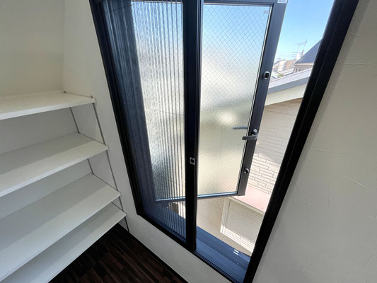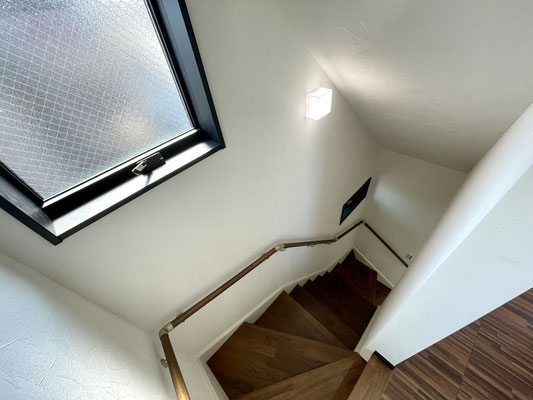 小窓も多く明るい雰囲気の階段を上がった所にはランドリースペースがあります。