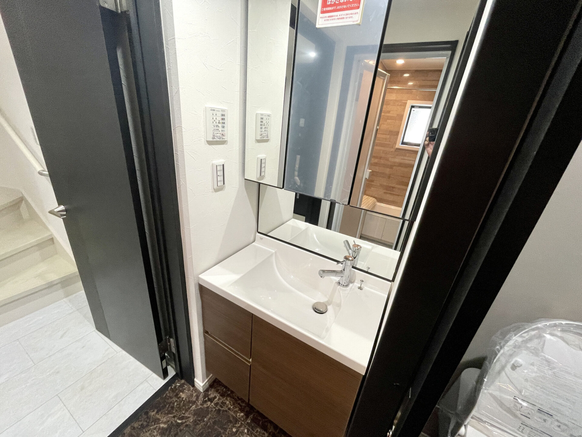 鏡部分が広い洗面台は便利ですし空間が大きく見えるメリットもあります。