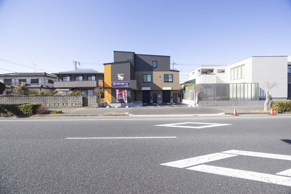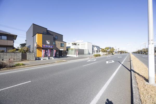 物件の前の道路はバスも通行する4車線の道路で見晴らしがよく、スムーズに敷地に入れそうです。