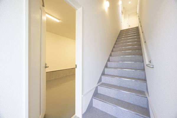 階段部分は複数の照明が真っ白な壁と天井を照らして、とても明るい雰囲気です。