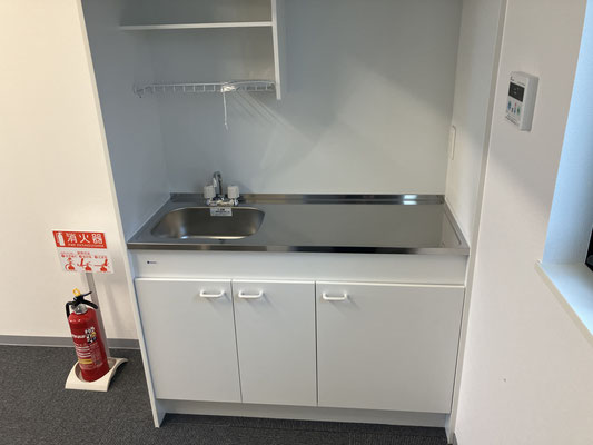 ホワイトで統一された給湯スペースには、上にも下にも収納があります。