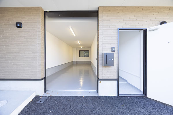 手前をバイク置き場にすることで、ガレージのシャッターを開ければすぐにバイクを取り出せるため、