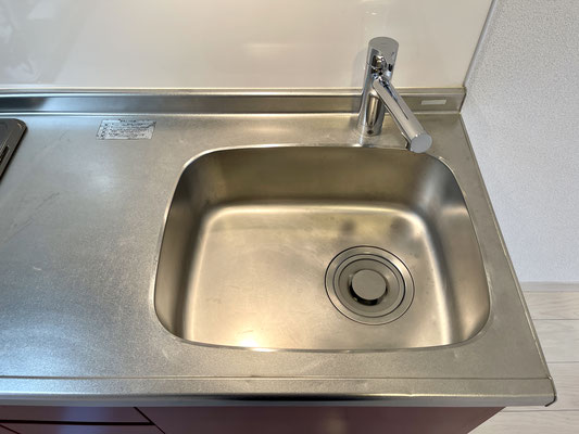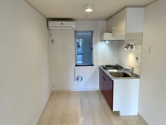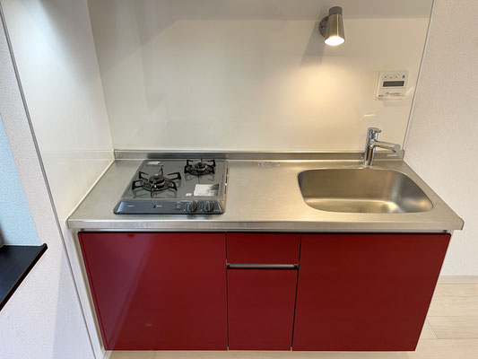 お部屋の奥には赤の可愛いシステムキッチン。