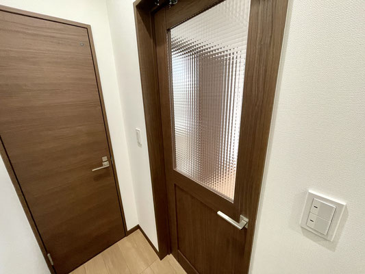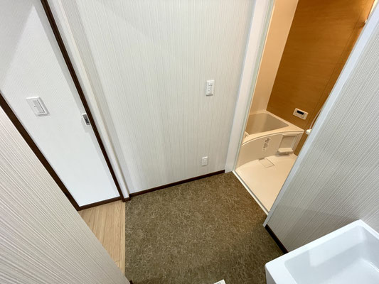 リビングに戻ってキッチンの後ろにあるスライドドアを開けると水回りがあります。
