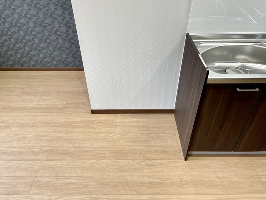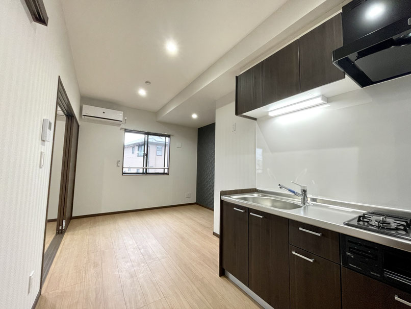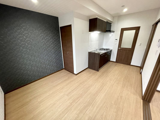 ナチュラルなフローリングと黒系のアクセントクロス、濃いめのウッドなドアやキッチンが特徴的なお部屋です。